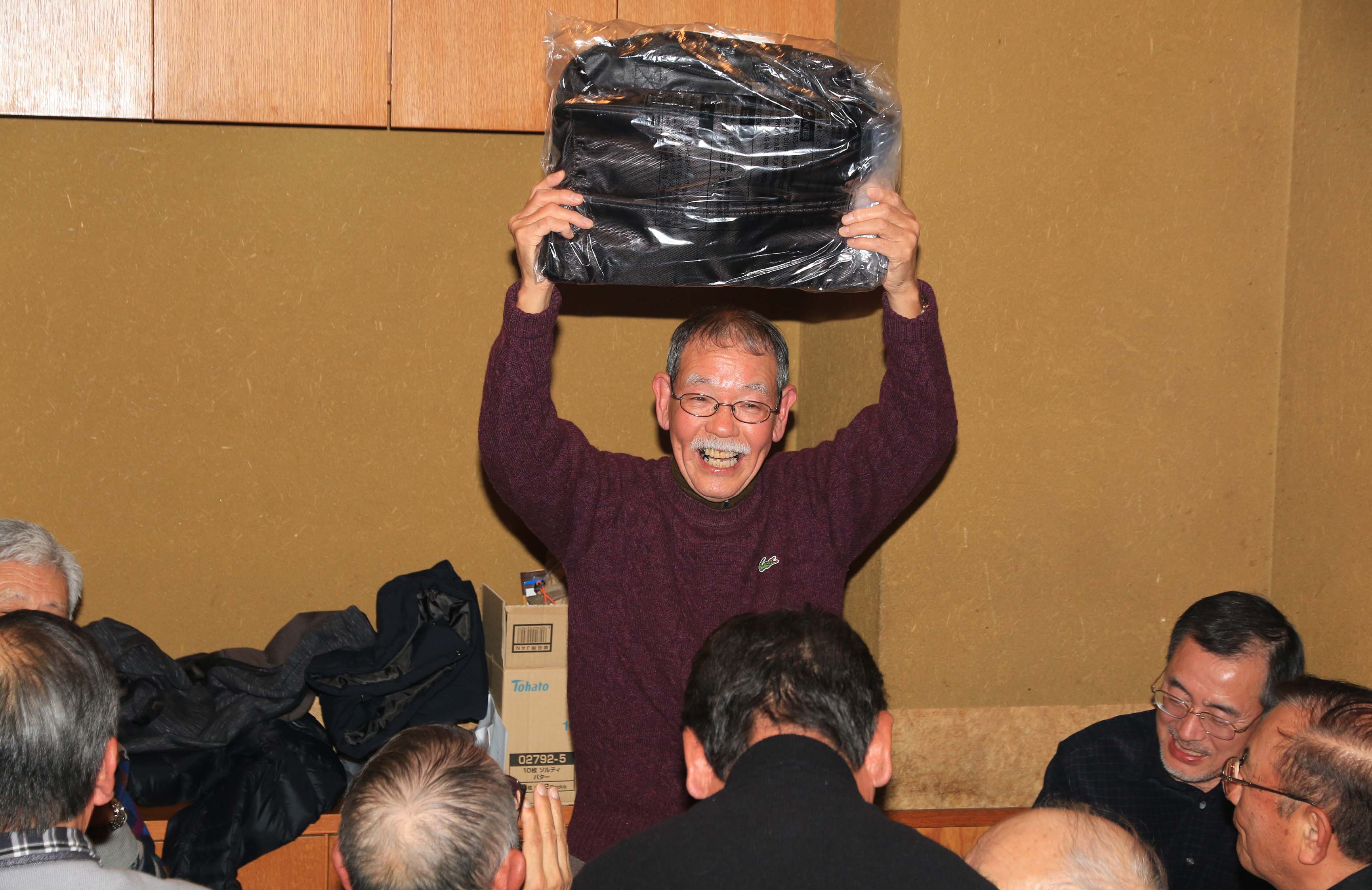 宴は途中に抽選会をはさんで続きました。抽選会の目玉、ゴルフバッグは、山中さんと上田さんが引き当て、 プレゼンターの吉田顧問から手渡されました。